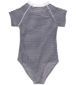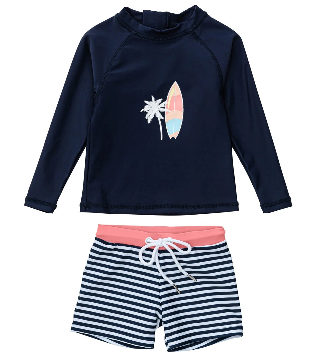 Surfs Up in The Sunset Cruising Long Sleeve Baby Set. Featuring a protective long sleeve rash top in Navy, with signature Surf print, and matching swim shorts in Navy/White stripe. Made using The UPF 50+ Sun Protection fabric, to help protect the little ones skin from the harmful suns rays.