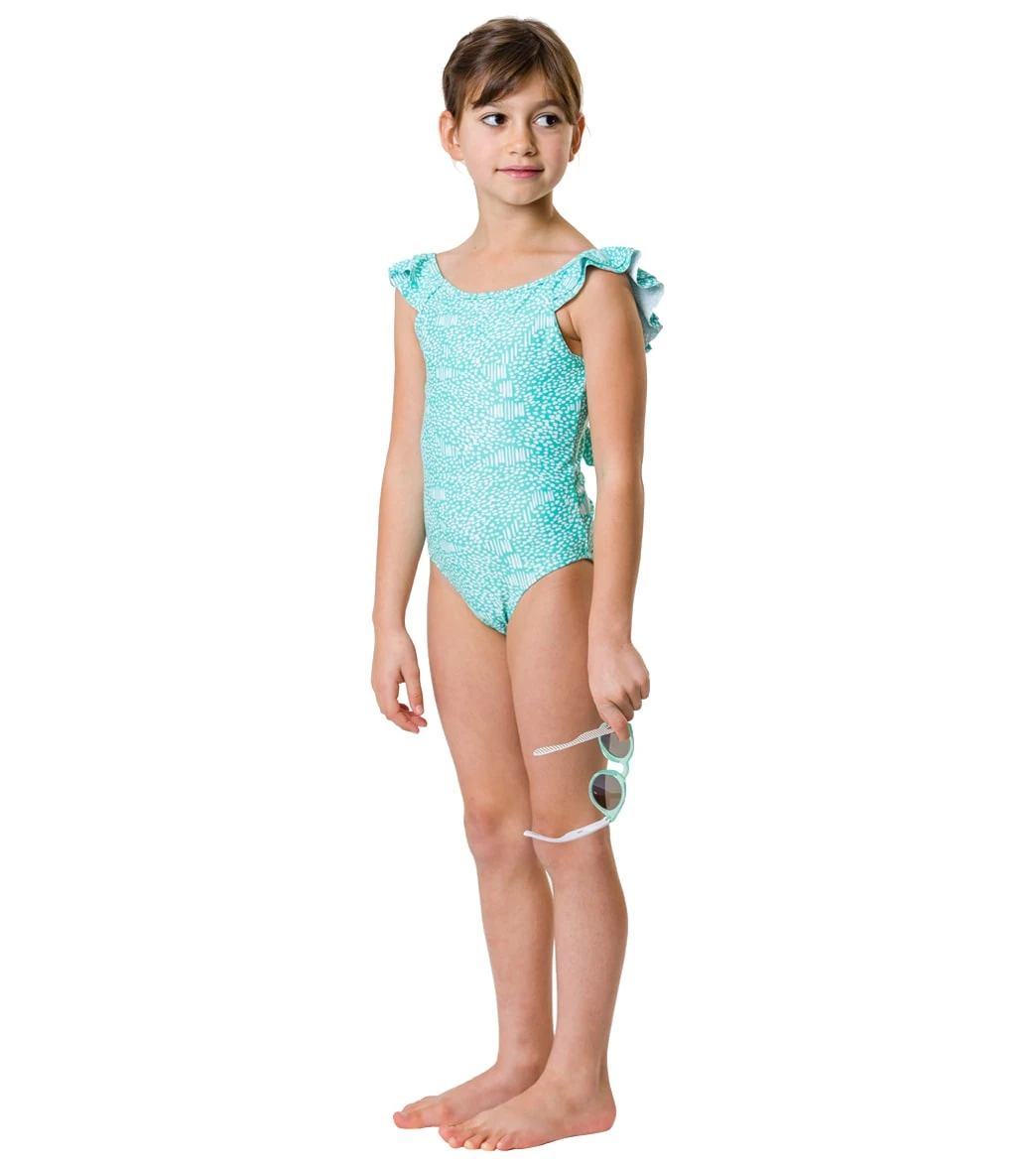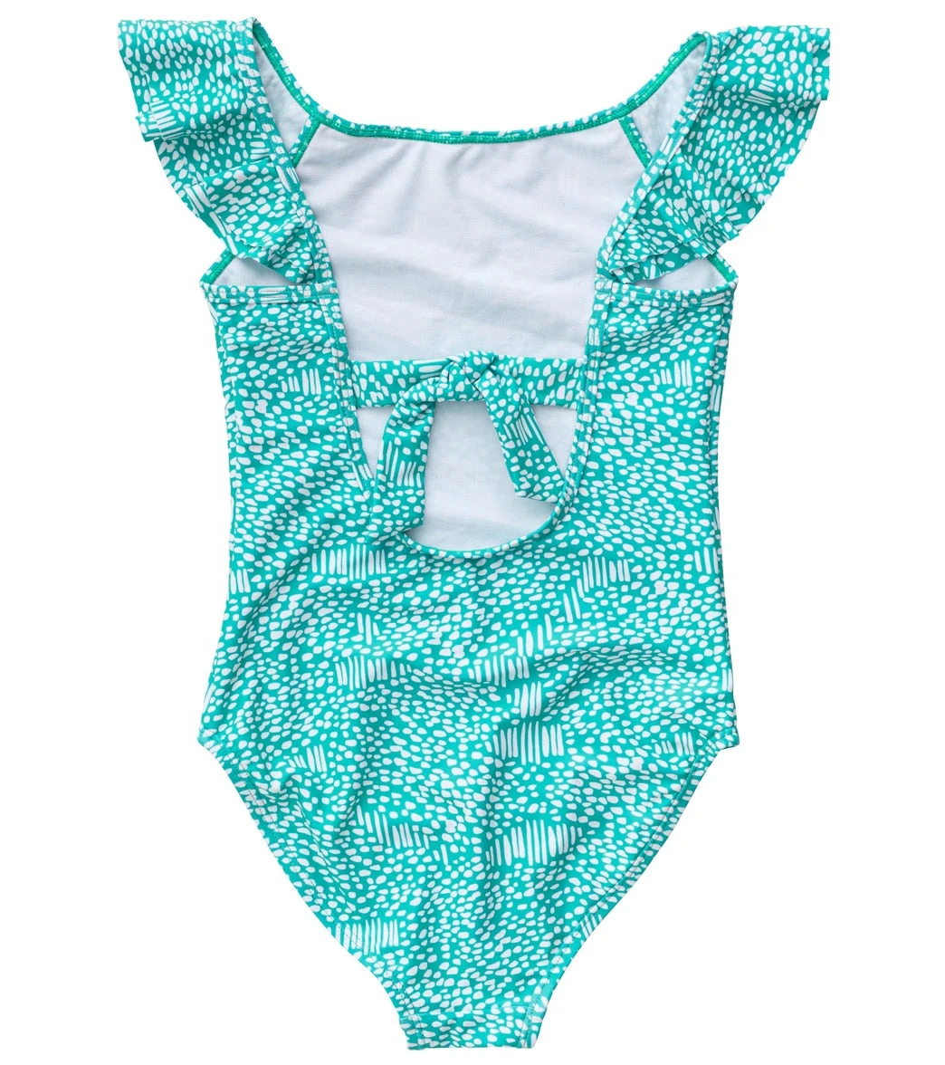 Diving and floating are perfect in The Spearmint Spot Flutter Swimsuit. Featuring a feminineflutter sleeve detail and fixed back strap with bow. Made using UPF 50+ Sun Protection fabric, helping to protect your skin from the suns harmful rays.