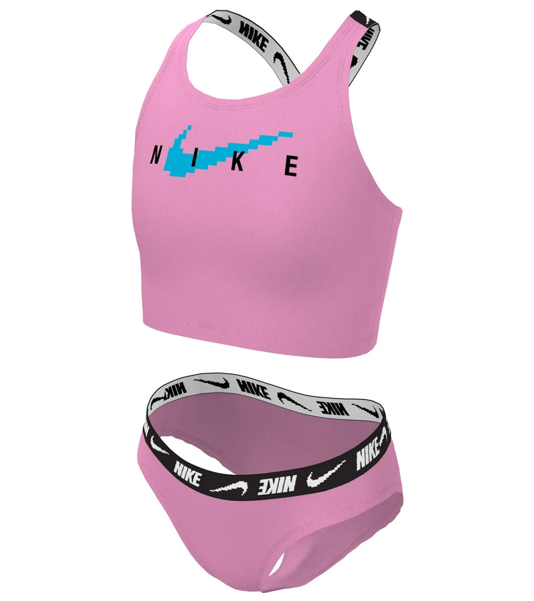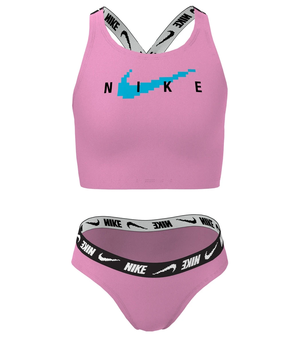 The Nike Girls Logo Tape Two Piece Midkini Set (Big Kid) is both stylish and durable for a variety of water activities.